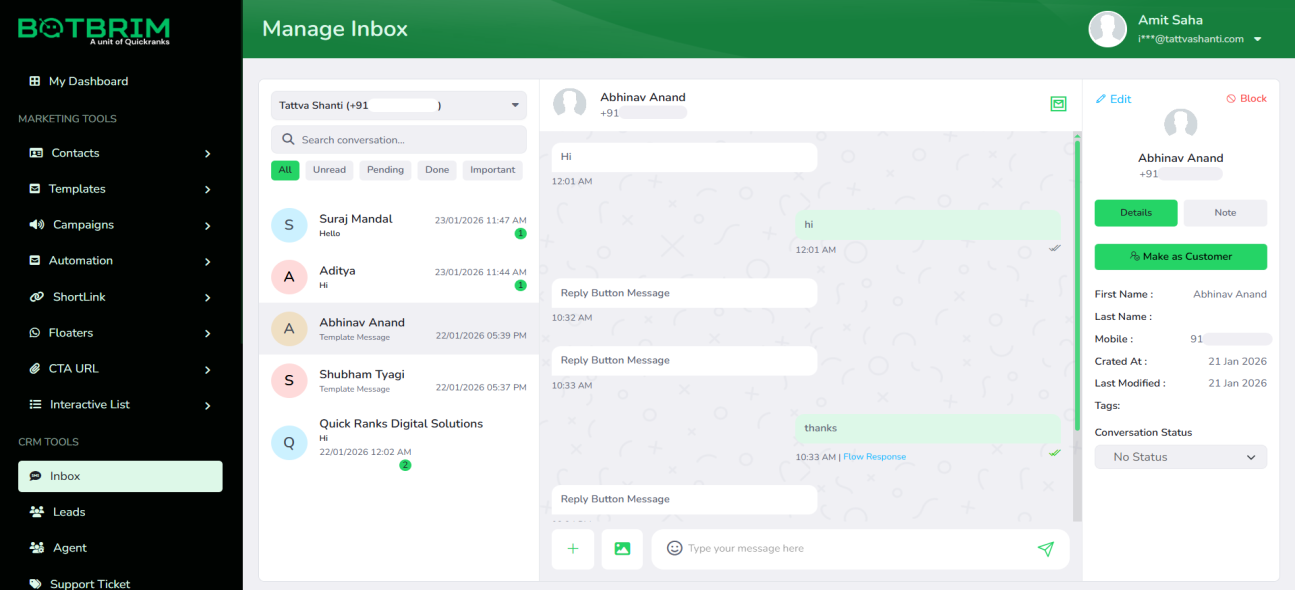 Botbrim is a complete cross-platform WhatsApp CRM and marketing tool that helps businesses manage conversations, automate customer engagement, and run marketing campaigns through WhatsApp.